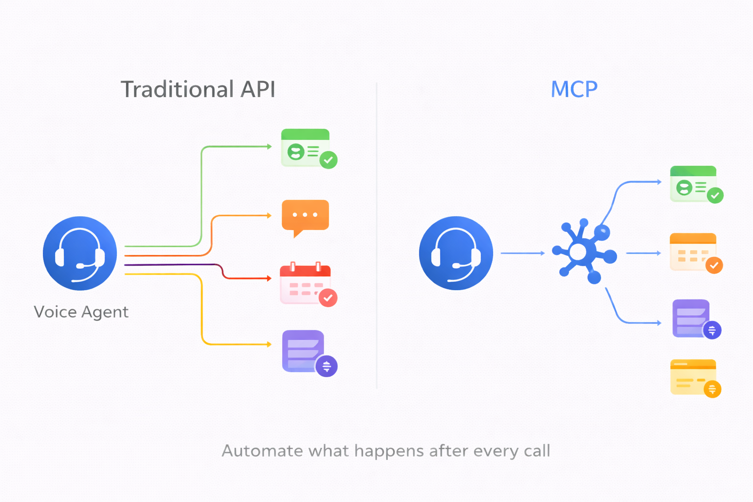 Mid-call tool selection: With APIs, every tool the agent might need must be wired in before deployment. If a caller asks for something you didn't anticipate, the agent can't help. MCP lets the agent discover tools at runtime and pick the right one per request. Add a new MCP server on Monday, and every connected voice agent can use it by Tuesday.