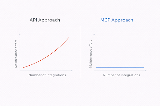 Maintenance cost: When a third-party API changes its auth method or response format, every agent using it needs a code update. Ten agents mean ten patches. With MCP, you update one server, and all connected agents inherit the fix. The more agents and services you run, the wider this gap gets.